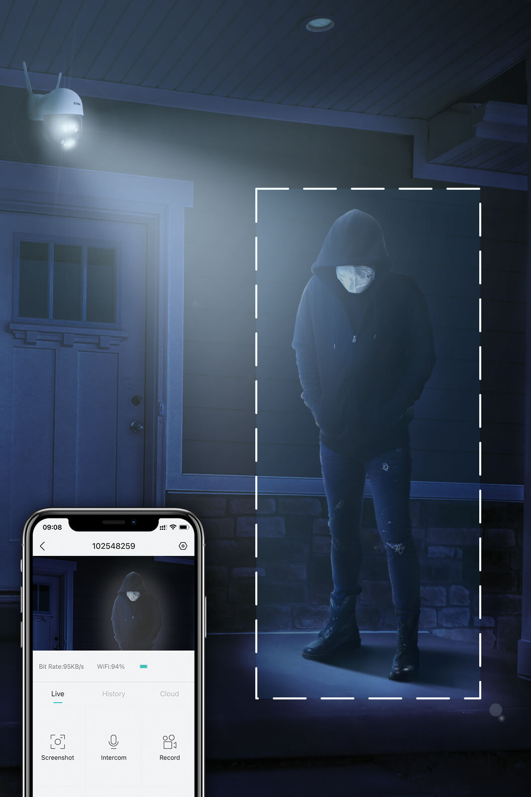AI機能を搭載、IPカメラ本体内にAI画像認識機能を標準搭載、人体検知検知を自動的に識別して無料でアプリに送信します、誤検知も減らして、防犯効果もアップ!