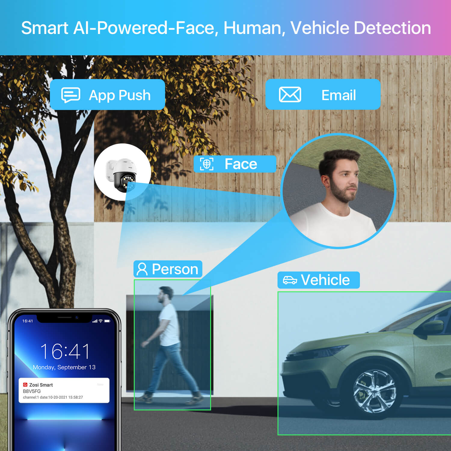 AI人体、AI顔、 AI車両検知機能搭載、高精度のAI検知機能によって、カメラの前人、車の侵入を検知し、侵入の瞬間を画像をスマートフォンににプッシュします、犯罪や現場の危険を未然に防ぐことができます。